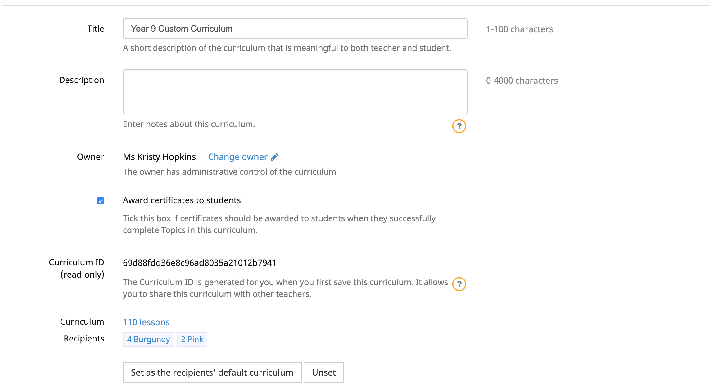 If the curriculum is to be the students' new default curriculum, select ‘Set as the Recipients’ Default Curriculum’. When the students next log in this curriculum will be displayed. Click 'Unset' to remove as the students' default curriculum.